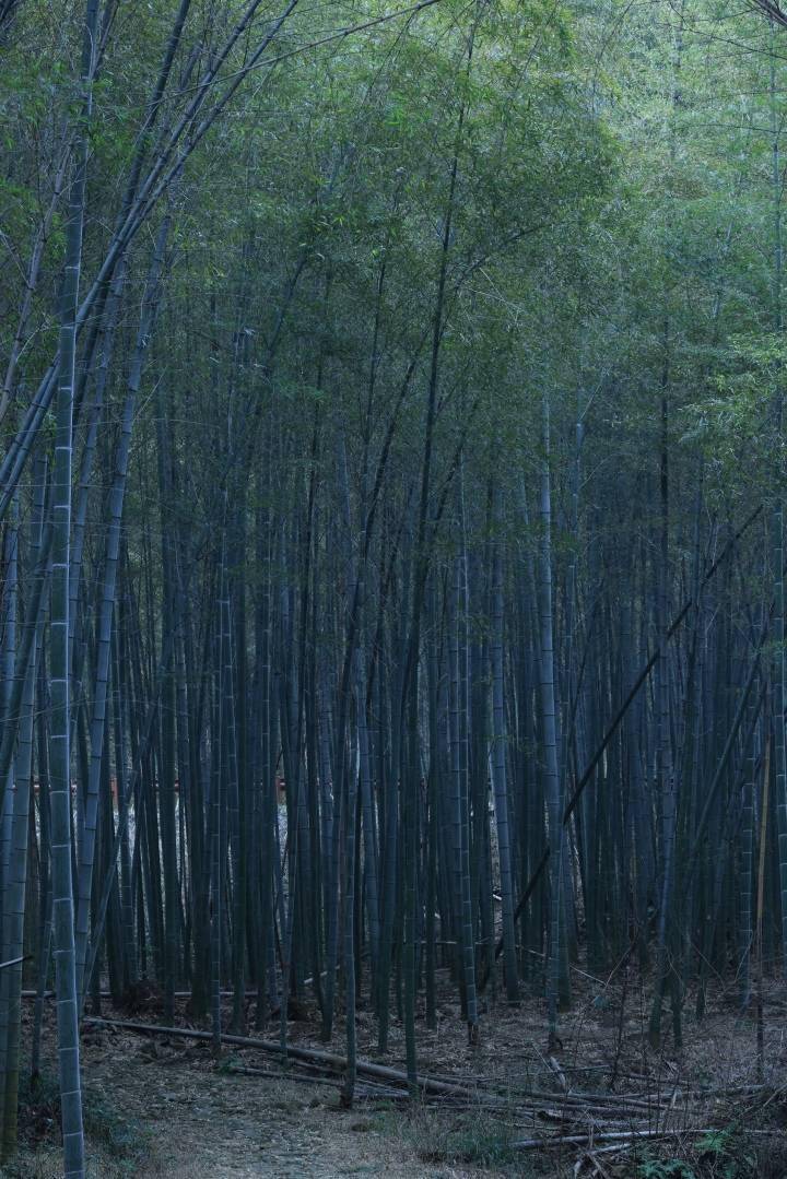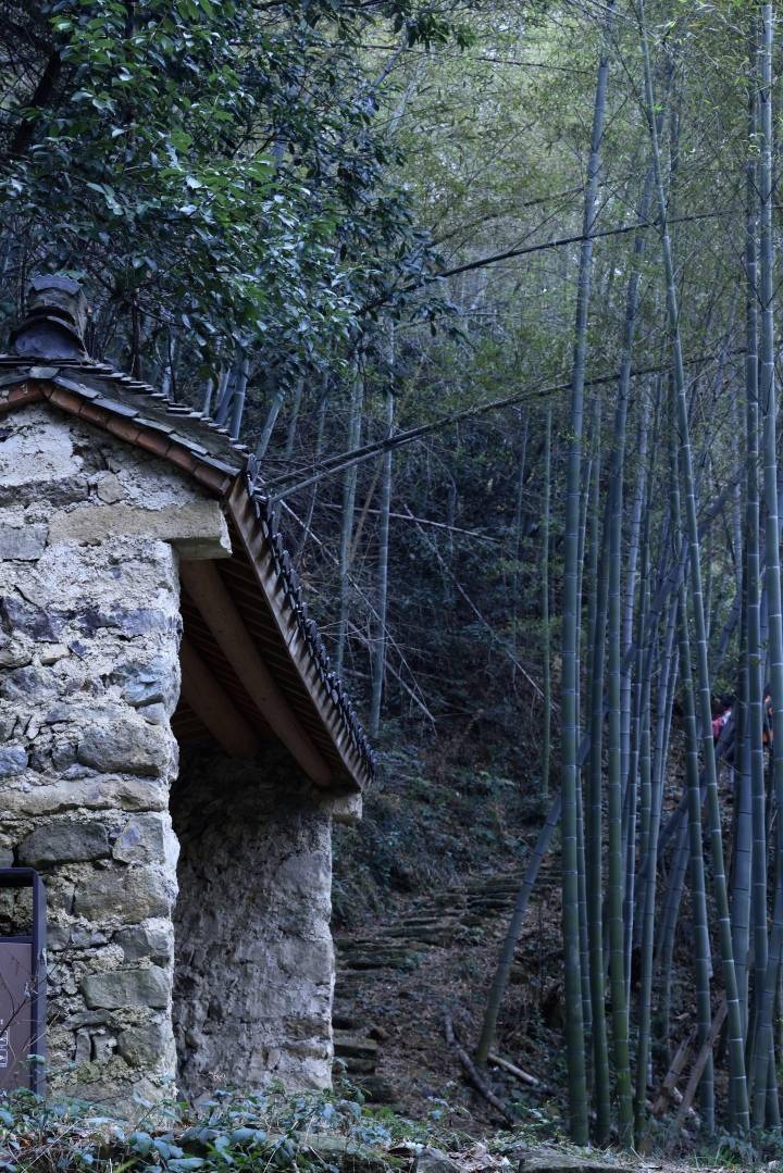 萧绍古道入口处的一片竹林前,有一块大石头上用篆体刻着“致远”二字,沿路的亭阁修整得很完善,和竹林、树木彼此衬托,地上用石头铺成,路面古拙完好。连日阴雨地上湿润,阴沉的气候,在古道竹林和树荫中穿行,幽静奥秘,颇有些古拙传奇色彩。举目远眺,恍然见到李慕白和玉娇龙在竹稍上飘忽过的身影,闭目静听,坎坡岭的密林里传出越王练兵的厮杀叫喊声。