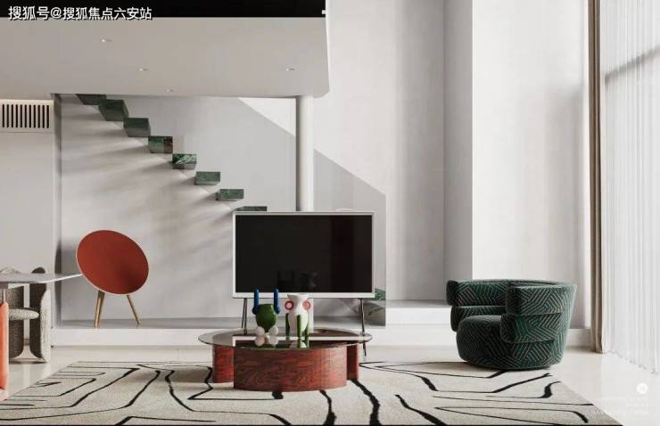 茶几底座的赤色科技木皮纹理与赤色装修遥遥相对,在活动的地毯上,它也变成了一座岛屿。