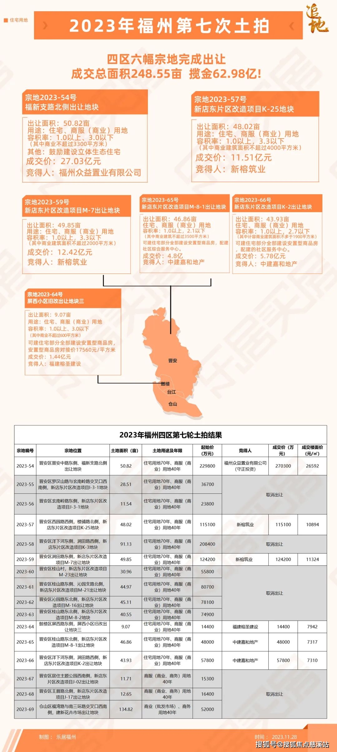 11月28日,2023年福州四城区第七场土拍闭幕,6幅地块总起拍价58.93亿。土拍招引建发、国贸、保利、联发等房企报名等10余家房企参加,6幅地块算计揽金62.98亿。