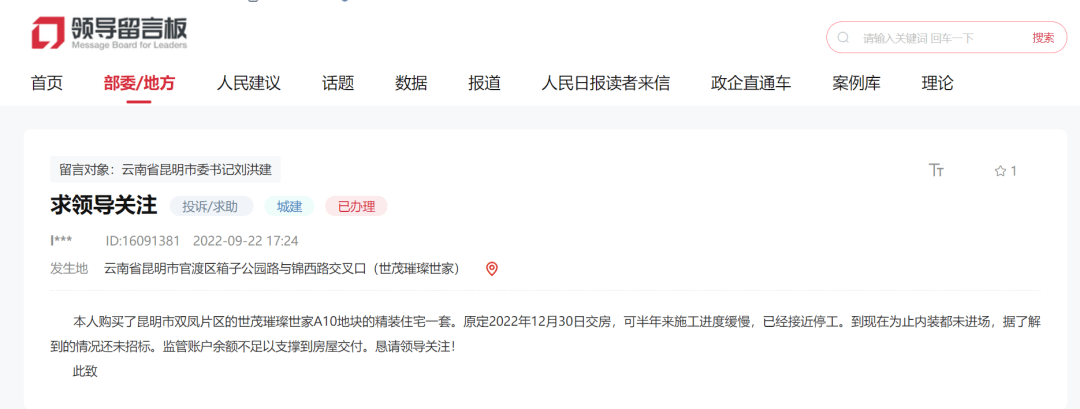“我买了官渡区双凤片区的世茂璀璨世家A10地块的精装住宅一套,原定2022年12月30日交房,但近半年来施工进度缓慢……
