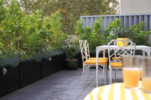 整齐地摆放着大型丛生植物,可以真正俯瞰整个城市,并拥有一个宽敞而优雅的阳台。城市风光和自然元素的融合创造了最迷人的阳台花园之一。